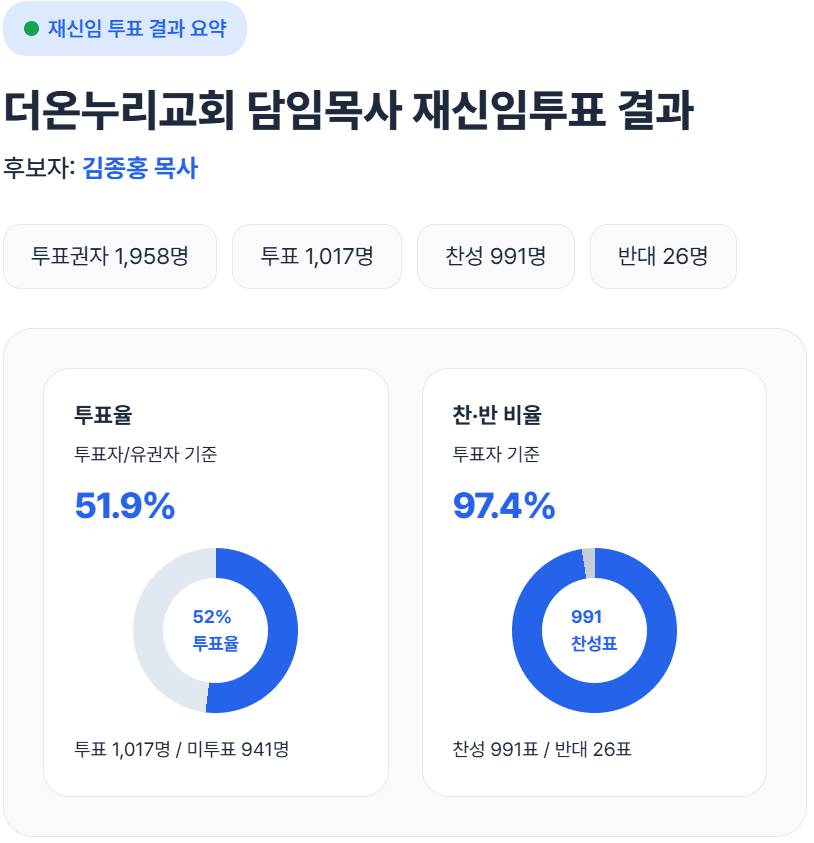 ♥신임투표 교회 정관 제 10조 3항 2~6호(목사 청빙 및 신임 관련 규정)에 따라, 김종홍 목사 신임투표를 진행합니다.