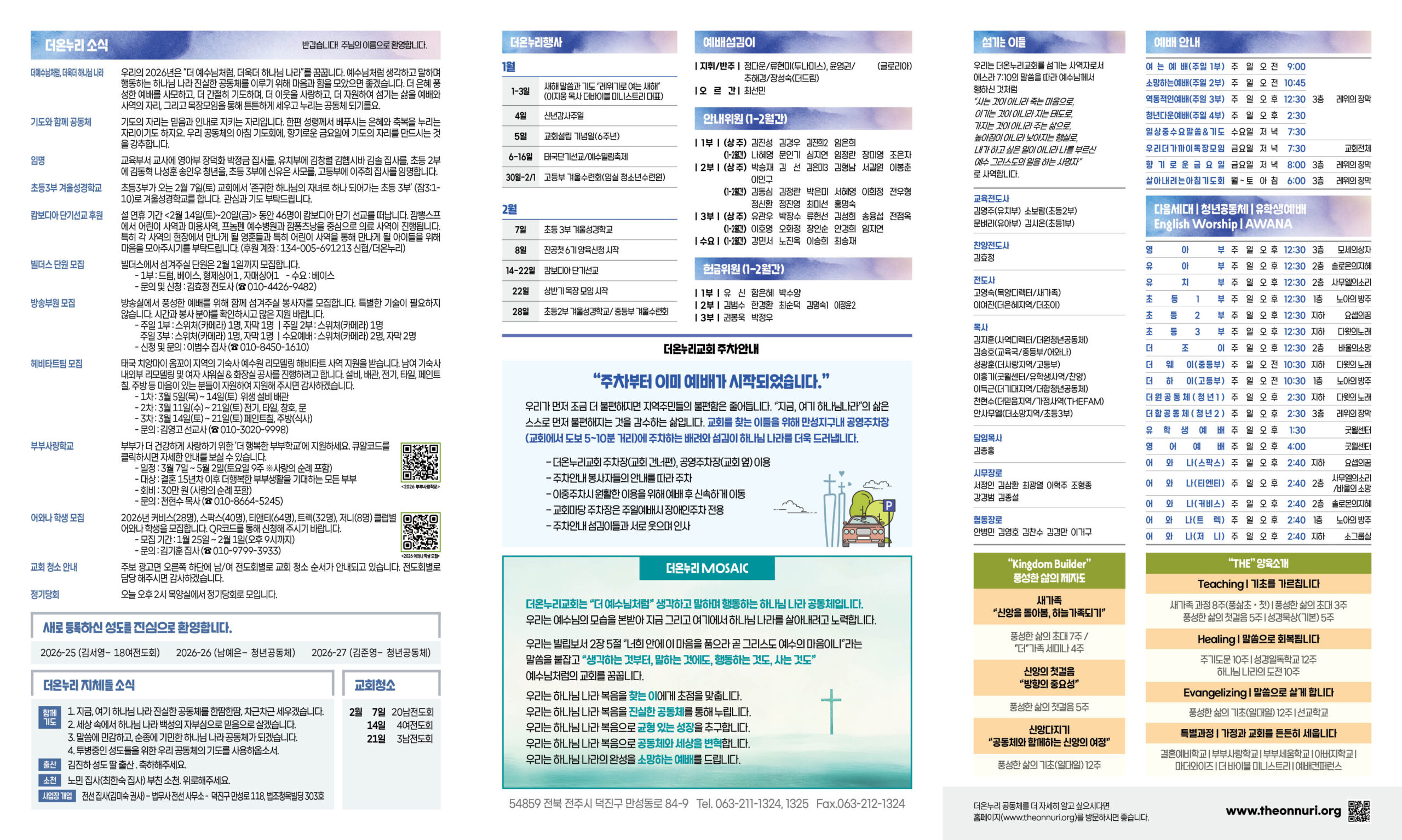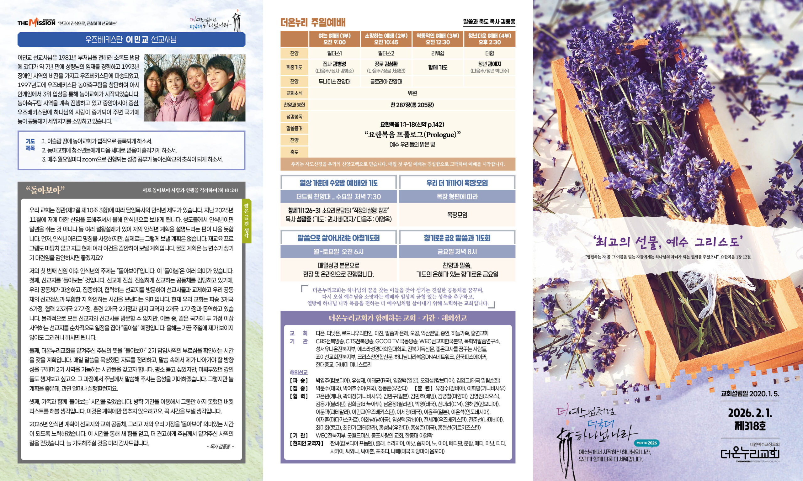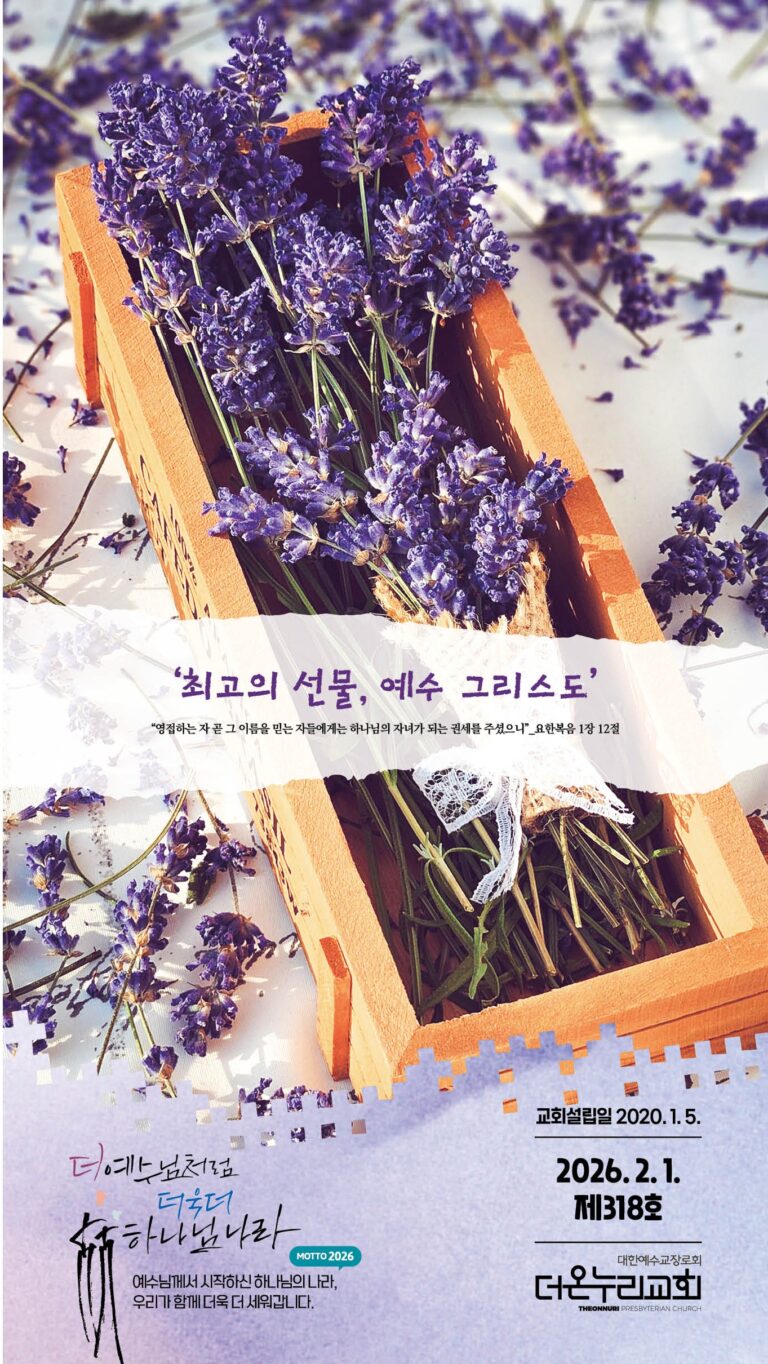 우리의 2026년은 “더 예수님처럼, 더욱더 하나님 나라”를 꿈꿉니다. 예수님처럼 생각하고 말하며 행동하는 하나님 나라 진실한 공동체를 이루기 위해 마음과 힘을 모았으면 좋겠습니다. 더 은혜 풍성한 예배를 사모하고, 더 간절히 기도하며, 더 이웃을 사랑하고, 더 자원하여 섬기는 삶을 예배와 사역의 자리, 그리고 목장모임을 통해 튼튼하게 세우고 누리는 공동체 되기를요.