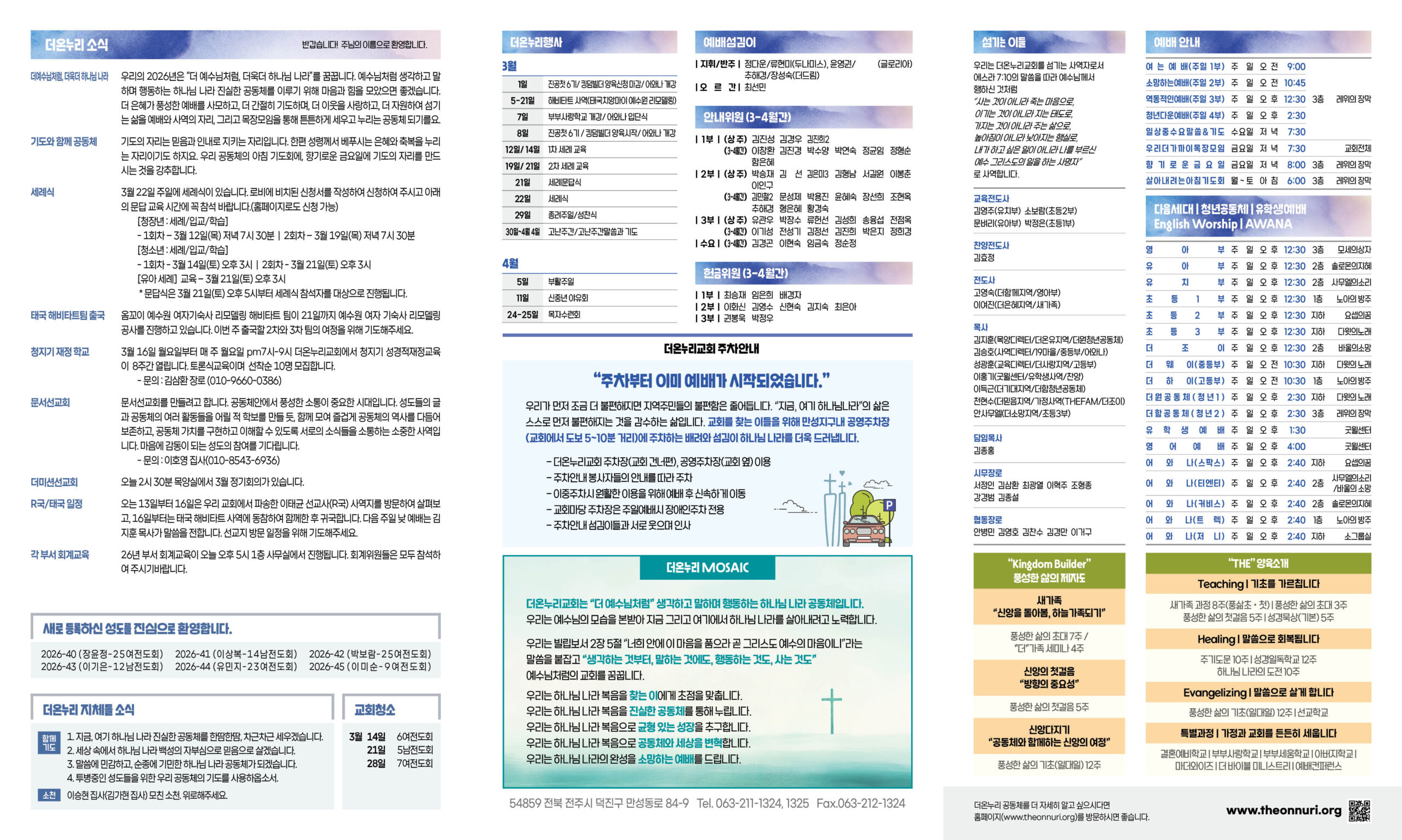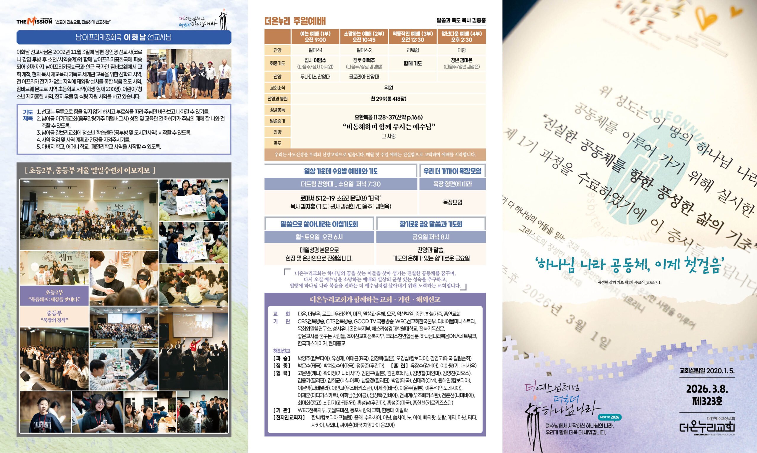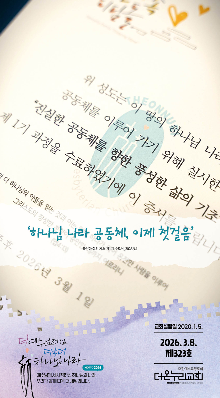우리의 2026년은 “더 예수님처럼, 더욱더 하나님 나라”를 꿈꿉니다. 예수님처럼 생각하고 말하며 행동하는 하나님 나라 진실한 공동체를 이루기 위해 마음과 힘을 모았으면 좋겠습니다. 더 은혜가 풍성한 예배를 사모하고, 더 간절히 기도하며, 더 이웃을 사랑하고, 더 자원하여 섬기는 삶을 예배와 사역의 자리, 그리고 목장모임을 통해 튼튼하게 세우고 누리는 공동체 되기를요.